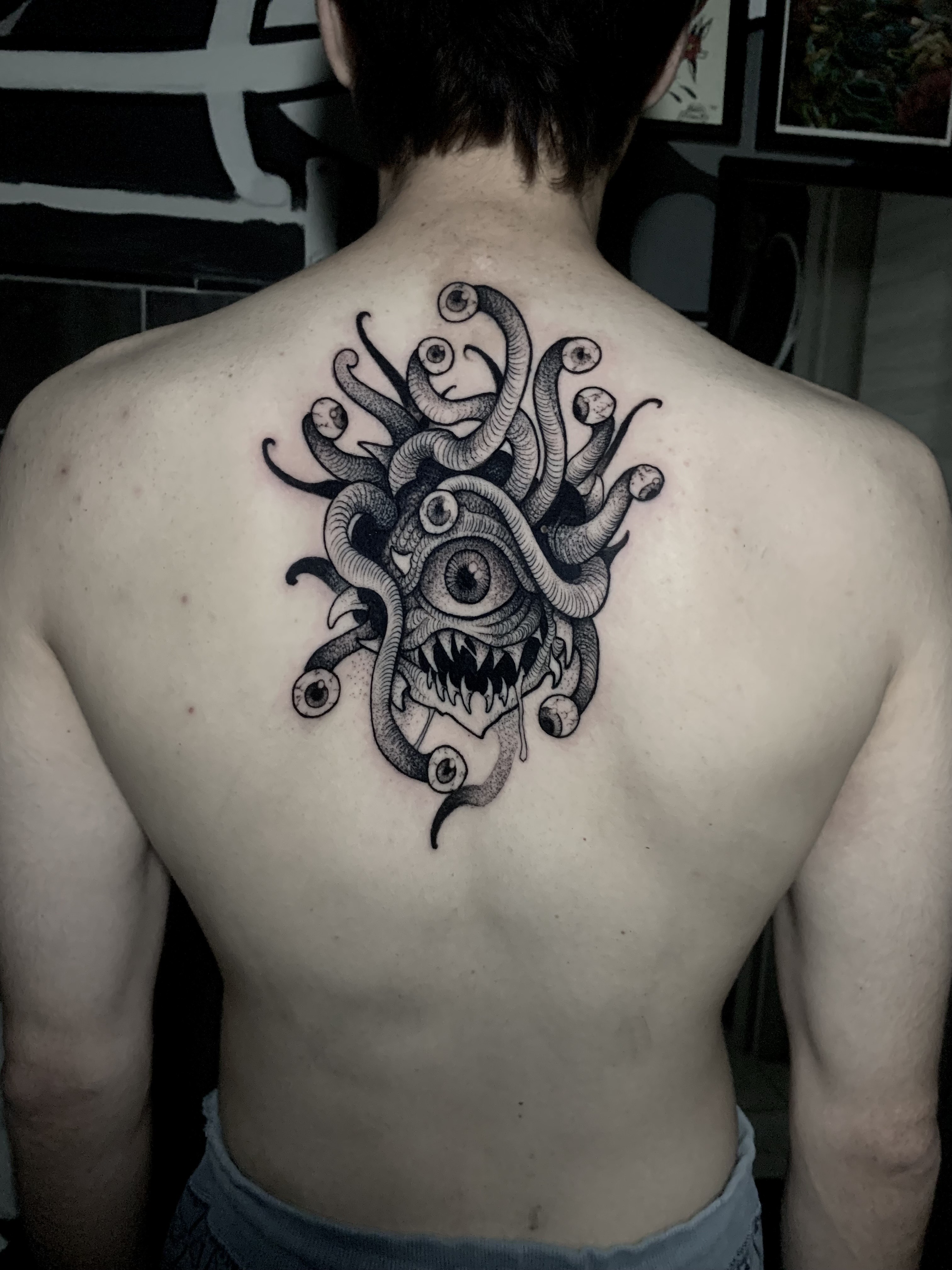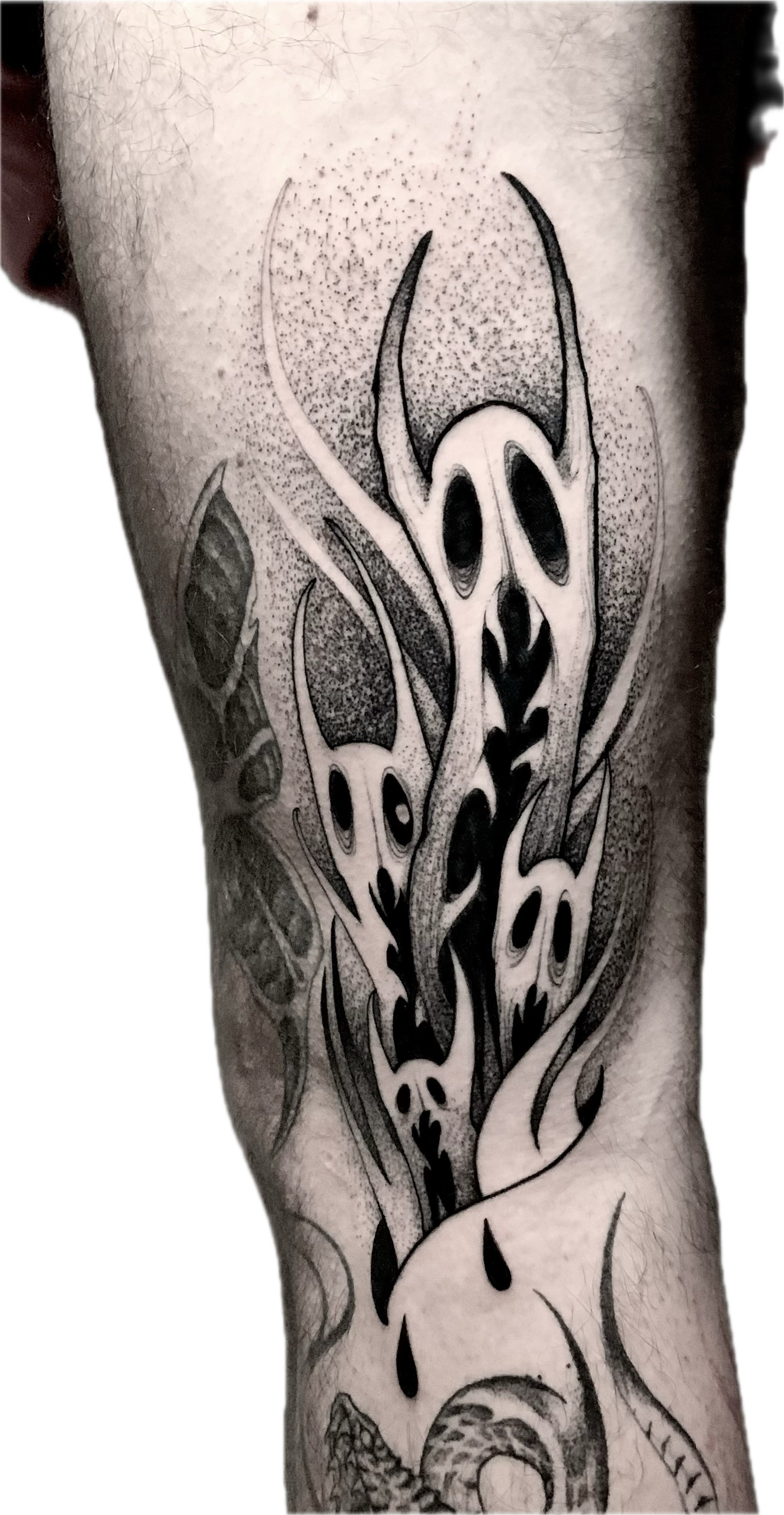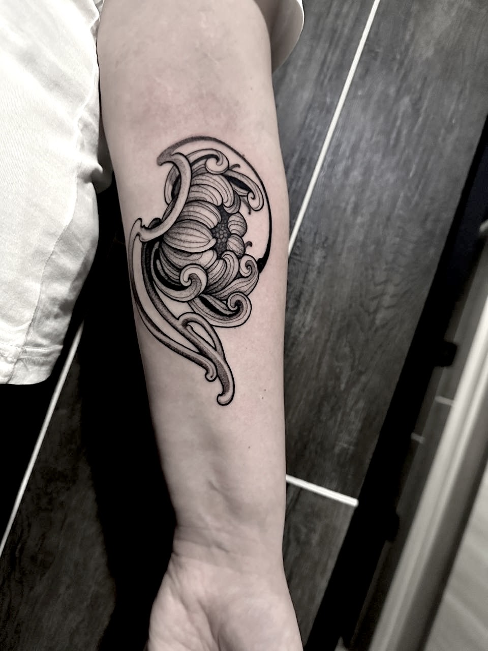 Over the course of my career, my artistic research has led me to develop the style I propose today: a fusion of Blackwork and Neotraditional, characterized by fluid forms strongly influenced by Art Nouveau, a marked contrast between black and skin, and references to the horror and dark imagery I've carried with me since childhood.